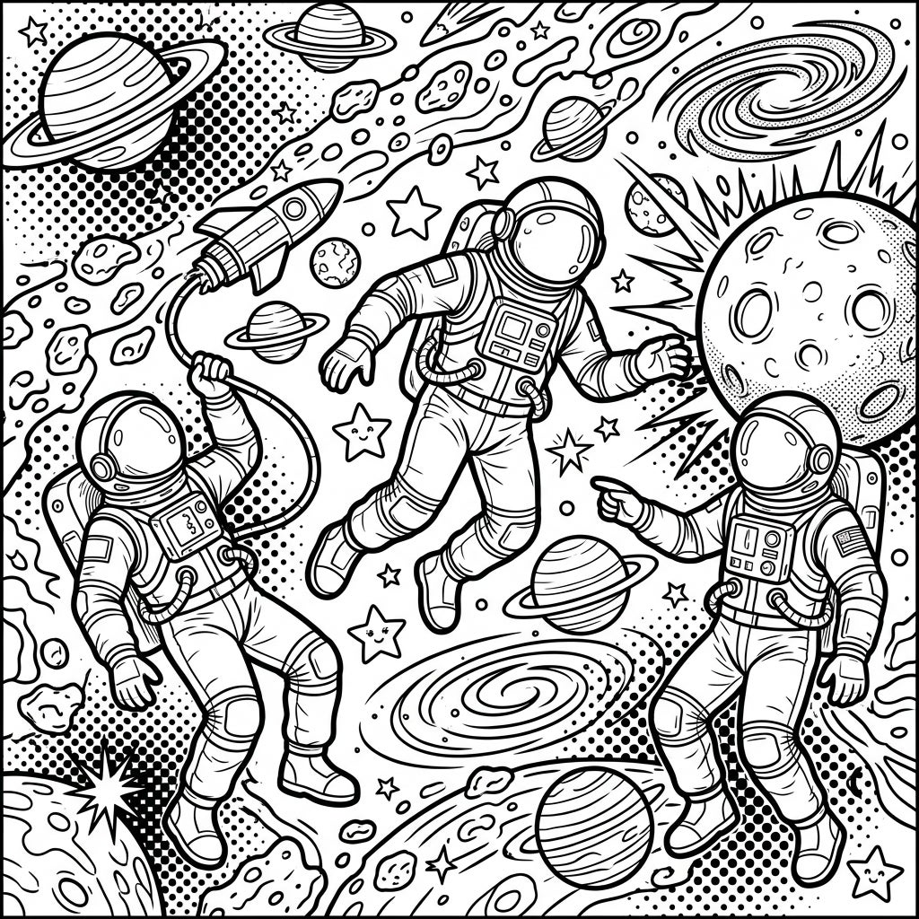 This coloring page is a true celebration of space exploration, blending the thrill of discovery with the iconic energy of Pop Art. Designed specifically for teens, the intricate details and dynamic composition offer a satisfying challenge, encouraging focus and artistic expression. Imagine yourself as a space artist, bringing to life the daring adventures of these cosmic travelers as they navigate through a visually rich interstellar landscape. It's an invitation to explore the boundless wonders of space through the lens of a cool, contemporary art movement.