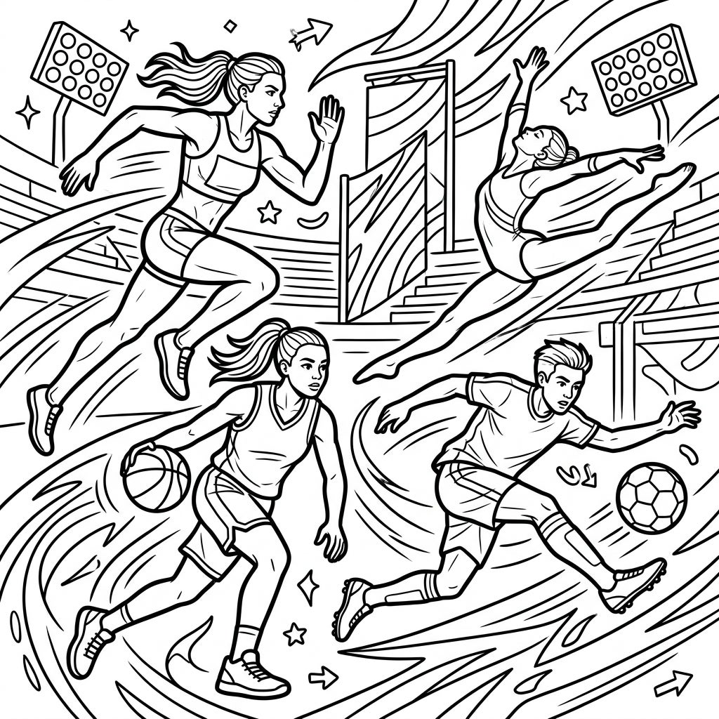 This captivating coloring page brings the energy of the sports arena right to your fingertips. Featuring four distinct athletes, you'll find a powerful runner mid-stride, a graceful gymnast soaring through the air, a focused basketball player dribbling with precision, and an agile soccer player in action. Each figure is rendered in clear, bold lines, surrounded by swirling motion effects and subtle stadium backdrops, creating a sense of exhilarating movement.