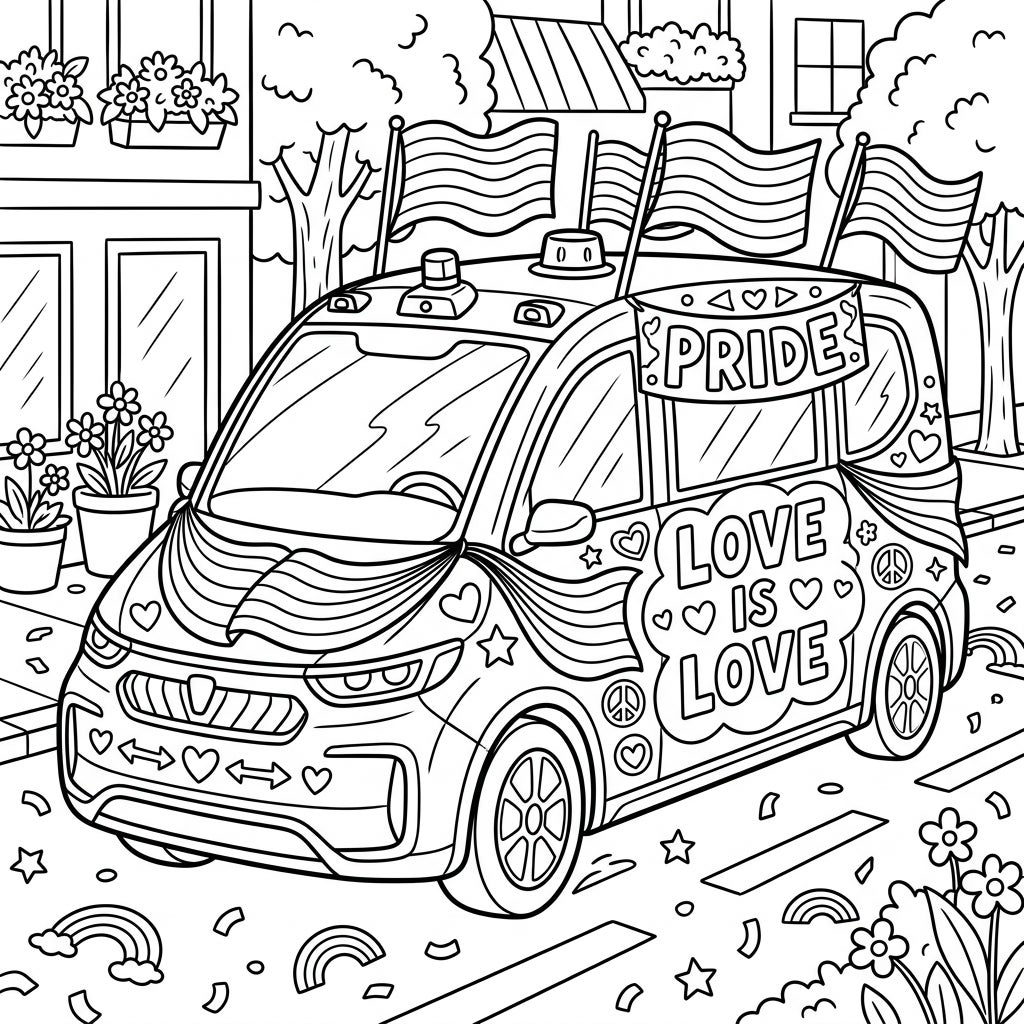 Dive into a unique celebration of technology and diversity with this captivating coloring page! Our design features a sleek autonomous vehicle, transformed into a moving monument of Pride. Adorned with flowing rainbow flags fluttering from its roof and front, a prominent 'PRIDE' banner, and the powerful message 'LOVE IS LOVE' emblazoned on its side, this self-driving car is ready to roll. Look closely to spot intricate details like hearts, peace signs, and stars decorating its body, set against a charming cityscape with buildings, trees, and scattered confetti, creating a festive atmosphere.