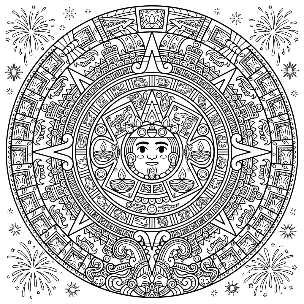 This extraordinary coloring template presents a harmonious fusion of two rich cultures. At its heart lies the iconic Aztec Sun Stone, reimagined with a friendly sun face, surrounded by its characteristic intricate carvings and concentric circles. Seamlessly integrated into this ancient structure are the vibrant symbols of Diwali: delicate diyas (oil lamps) glowing within the patterns, and dynamic fireworks bursting in the background, adding a celebratory atmosphere to the entire composition. Every segment is adorned with symmetrical, mandala-like patterns, inviting you to explore a world of detail.