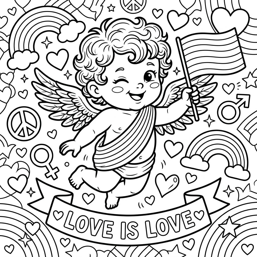 Dive into a world of joy and inclusivity with this captivating Baby Cupid Pride coloring page! Our adorable cherubic figure, complete with delicate wings and a mischievous wink, proudly holds a striped flag, ready to inspire a spectrum of colors. The entire page is a celebration of love, filled with a delightful array of intricate background elements like swirling hearts, twinkling stars, graceful rainbows, iconic peace signs, and meaningful gender symbols. A prominent banner across the bottom beautifully declares 'LOVE IS LOVE', creating a focal point for your creative expression.