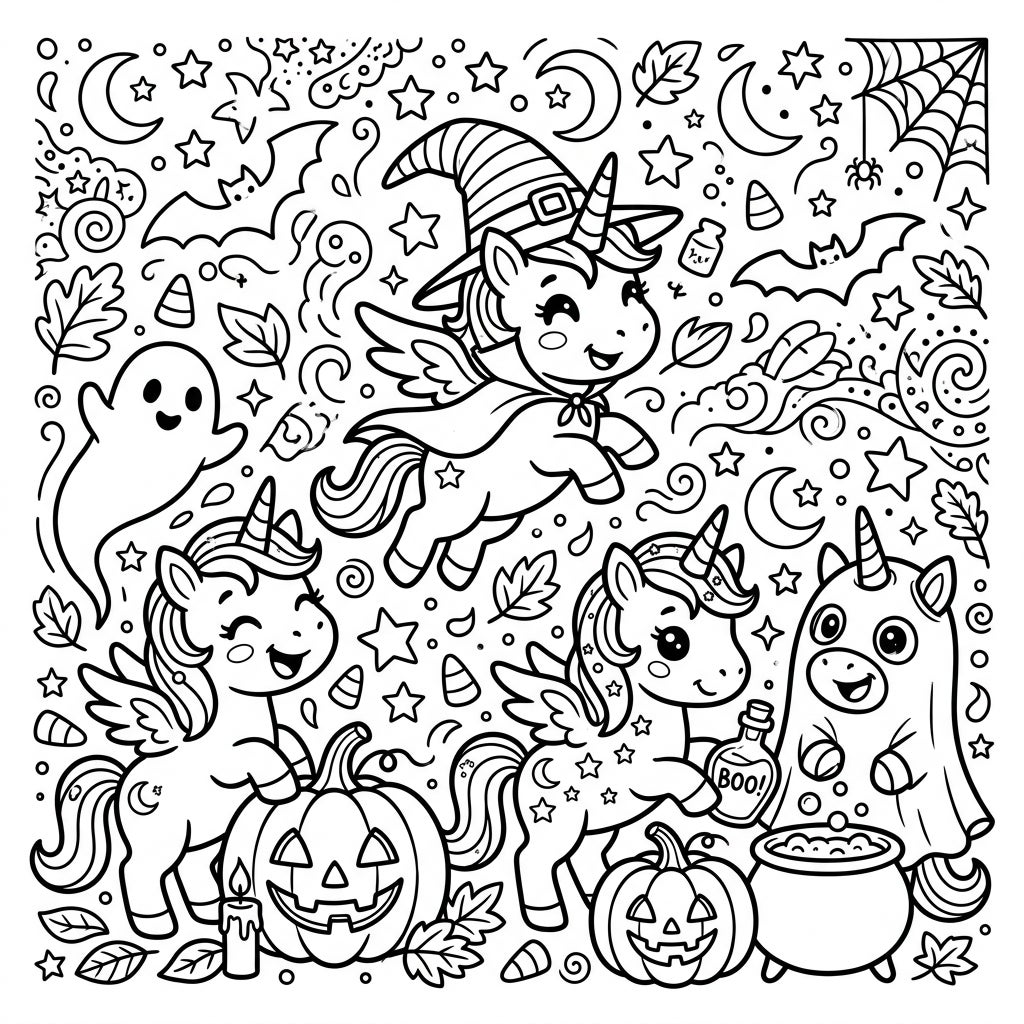This delightful coloring page is bursting with four charming baby unicorns, each ready for a Halloween adventure. One unicorn soars gracefully with a witch's hat and cape, while another stands beside a grinning jack-o'-lantern, complete with a flickering candle. A third baby unicorn holds a 'BOO!' potion bottle next to a bubbling cauldron, and the fourth is adorably disguised as a friendly ghost. The background is a whimsical tapestry of classic Halloween motifs, including fluttering bats, crescent moons, stars, candy corn, swirling patterns, and a shy little ghost floating by.