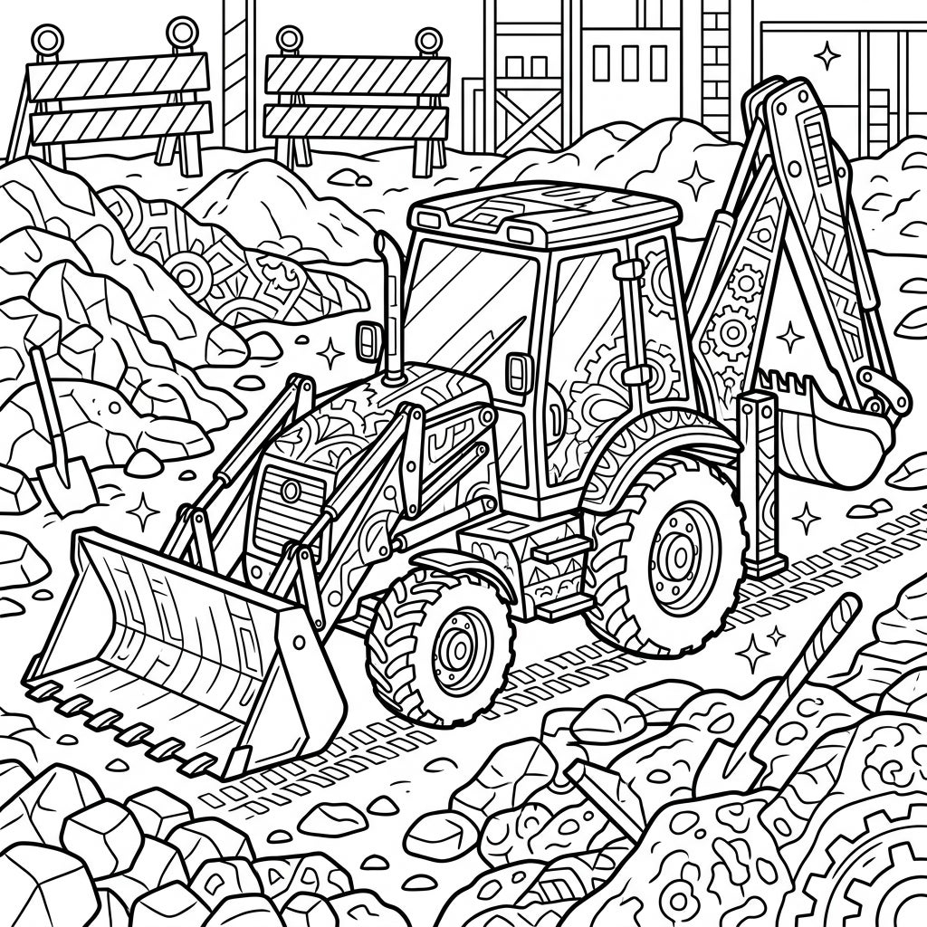 Explore the fascinating world of construction with this intricately designed backhoe coloring page. This detailed illustration captures a powerful backhoe, complete with its front loader and rear excavator, amidst a busy work site. Piles of rocks, mounds of earth, a handy shovel, and essential safety barriers in the background create a dynamic and immersive scene, inviting colorists to bring the construction action to life.