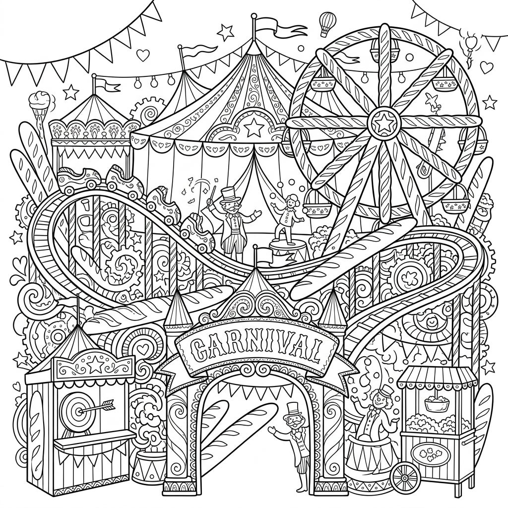 Step right up to a uniquely whimsical carnival where delicious baguettes form a wild rollercoaster! This intricate coloring page, designed for teens, is packed with exciting circus acts, fairground rides, and charming details waiting for your artistic touch.