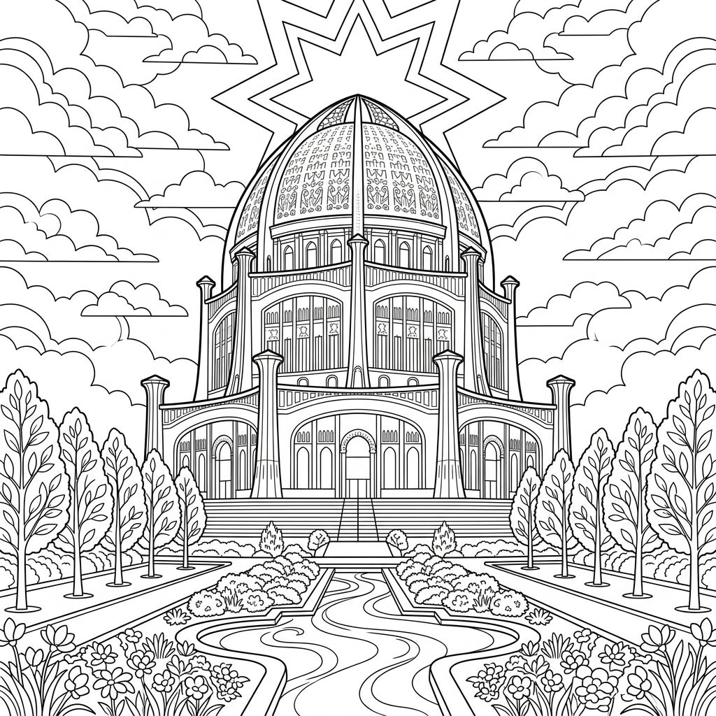 This captivating coloring template showcases a magnificent Baha'i House of Worship, an architectural marvel known for its distinctive nine-sided structure and grand domed roof. Every detail, from the intricate patterns adorning the dome to the gracefully arched windows and welcoming entrances, invites your artistic touch. The temple is nestled within a beautifully landscaped garden, featuring rows of elegant trees, meticulously manicured shrubs, and beds bursting with various flowers. A serene winding path or stream leads the eye toward the sacred building, all under a sky dotted with soft clouds and crowned by a symbolic starburst.