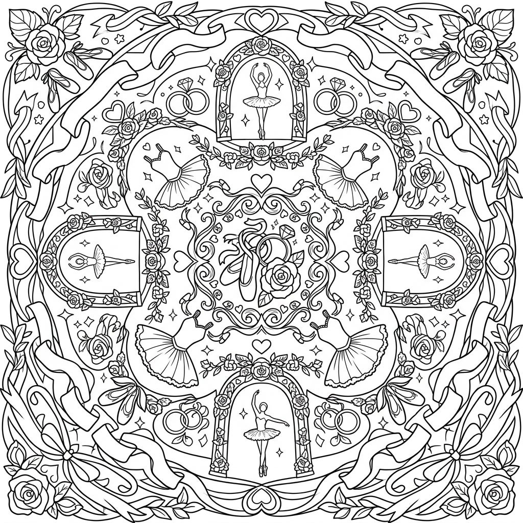 The symmetrical design unfolds with enchanting vignettes: graceful ballerinas in classic tutus pose within rose-laden arches, flanked by sparkling wedding rings. Scattered throughout are additional roses, subtle hearts, and flowing ribbons, all harmoniously blending to create a serene and celebratory atmosphere. Each segment of the mandala mirrors the others, inviting a thoughtful and relaxing coloring experience that honors both the discipline of dance and the joy of matrimony.