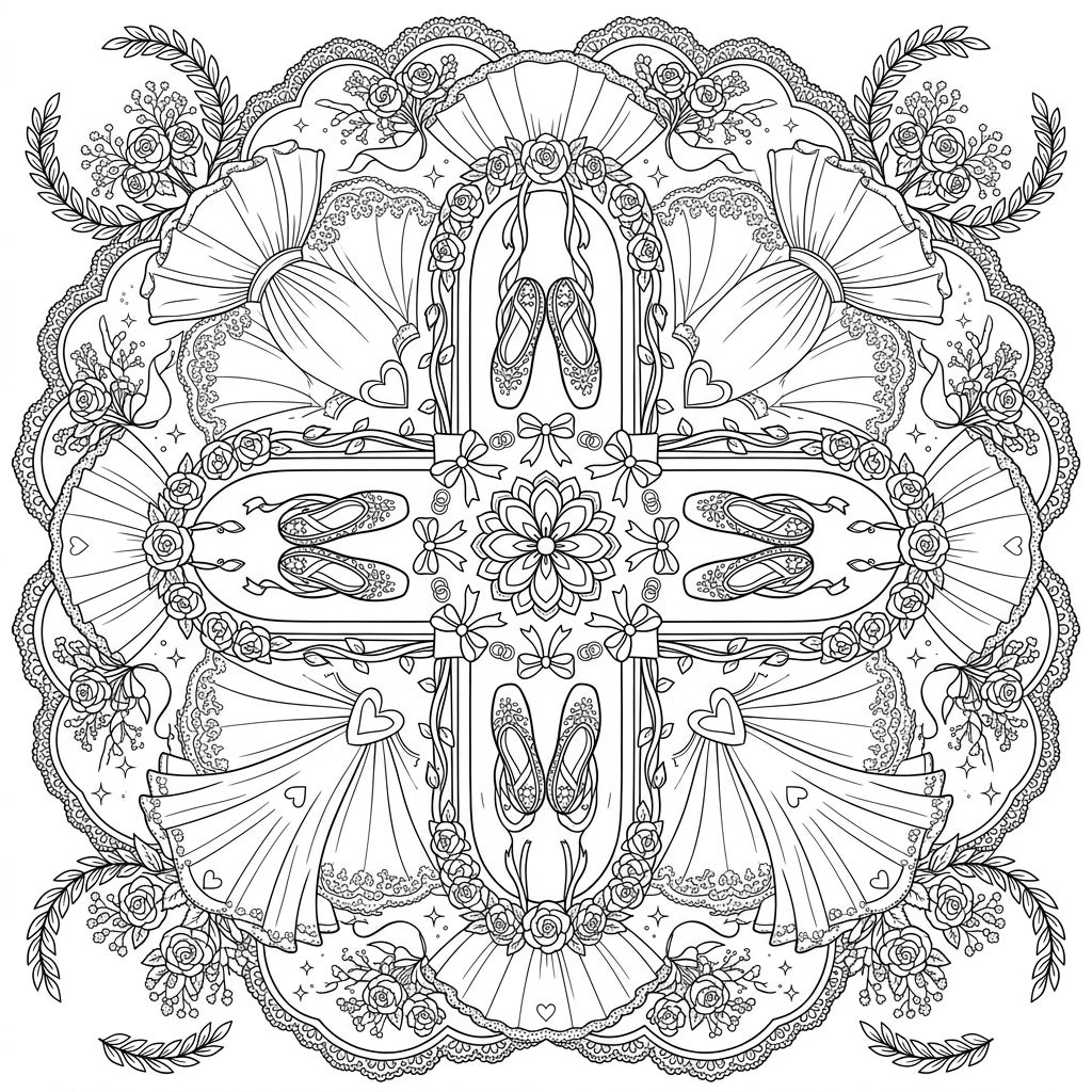 Step into a realm of refined beauty with our exquisite Ballet Wedding Mandala coloring page. This captivating design artfully blends the elegance of ballet with the joy of a wedding celebration, all encased within a meticulously crafted radial pattern. You'll find delicate ballet slippers adorned with intricate details, gracefully intertwined with flowing wedding dresses that seem to dance on the page. Floral arches, bursting with detailed roses and foliage, frame key elements, while playful ribbons and subtle hearts add touches of romance and charm.