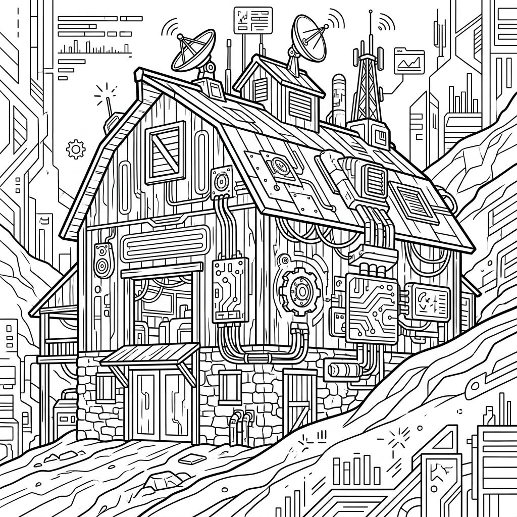 Unleash your creativity with this extraordinary coloring page featuring a bank barn re-imagined in a futuristic cyberpunk style. Dive into a world where rustic charm meets advanced technology, offering a truly unique artistic challenge.
