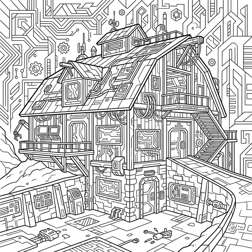 Embark on an extraordinary creative journey with our Cyberpunk Bank Barn coloring template, a masterful fusion of traditional architecture and cutting-edge technology. This intricate design showcases a classic multi-level bank barn, typically nestled into a hillside, now re-envisioned with a thrilling futuristic twist. Every façade of this unique structure is adorned with exposed wiring, sleek robotic components, advanced screens displaying circuit patterns, and complex high-tech doors, inviting you to bring this innovative world to life with your chosen hues.
