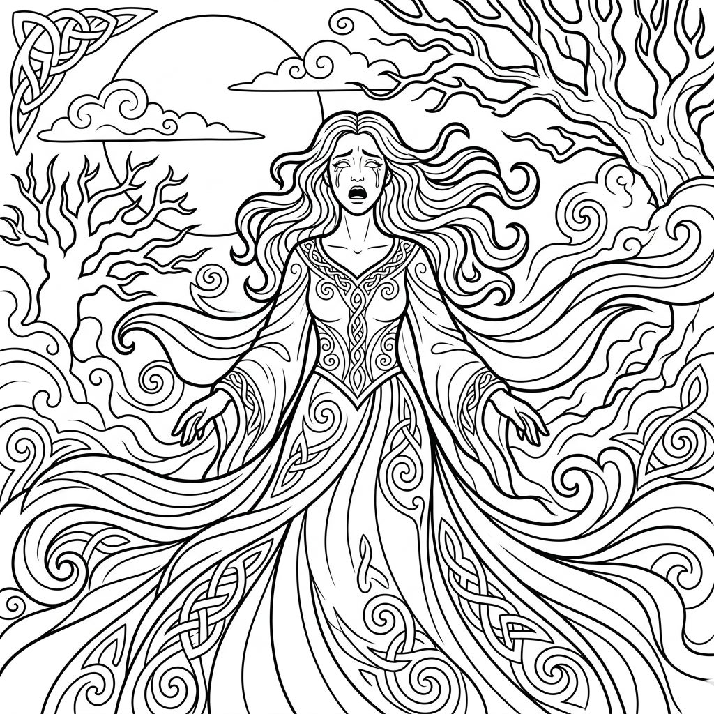 Explore the haunting beauty of Irish folklore with this intricate Banshee coloring page. Featuring a mournful spirit amidst swirling Celtic patterns and ancient trees, it offers a deeply engaging artistic experience.