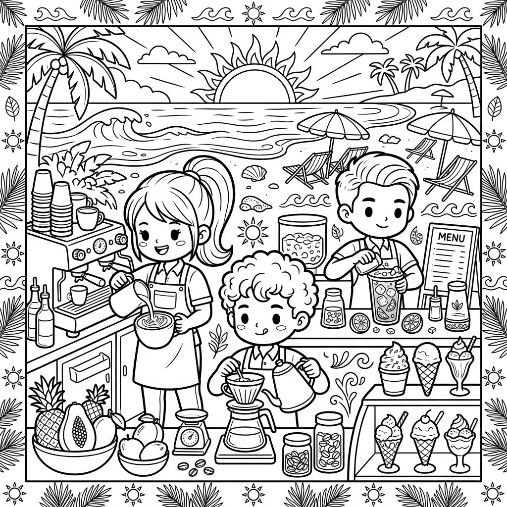 Transport yourself to a vibrant summer vacation with this delightful coloring page featuring skilled baristas. Enjoy bringing to life a bustling beachside cafe filled with delicious drinks and sunny details.