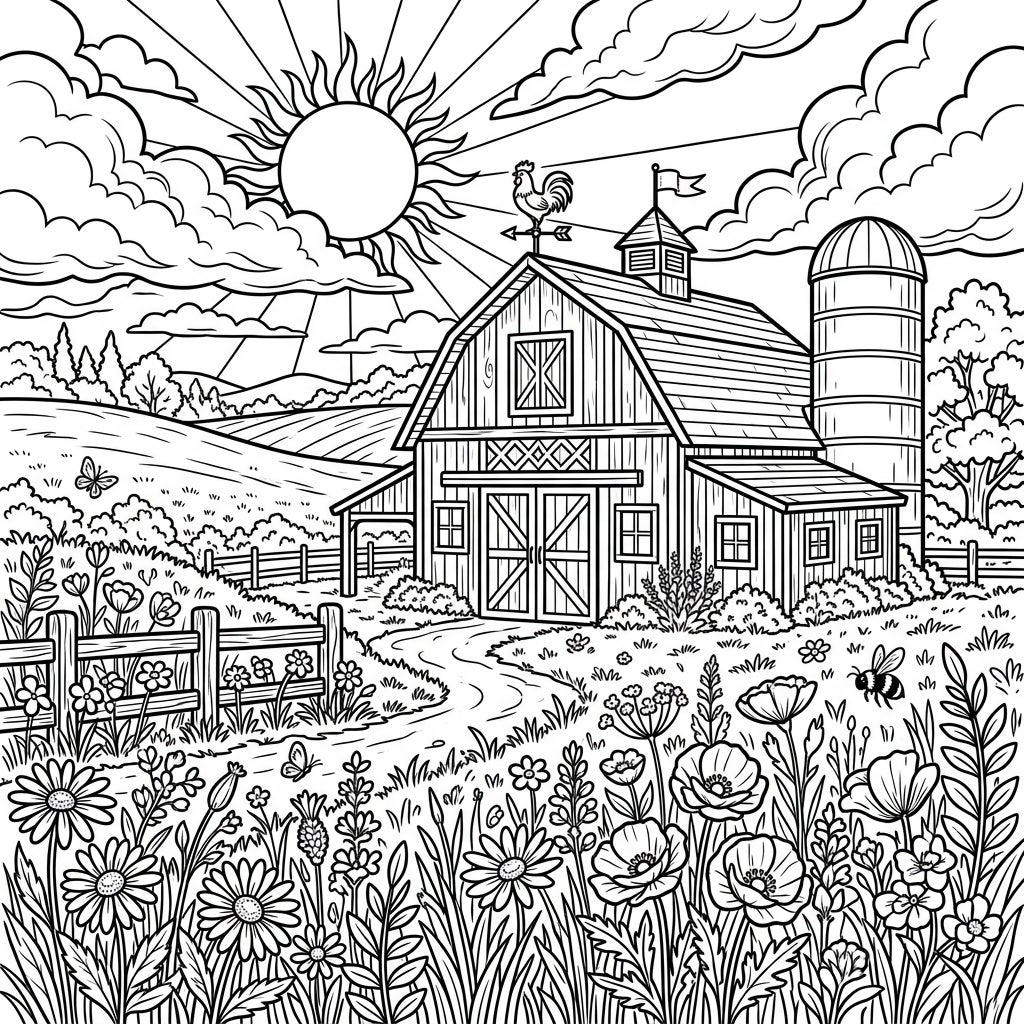 This intricately designed coloring page invites you to a charming rural landscape, centered around a classic wooden barn with detailed textures and prominent double doors. Beside it stands a towering silo, while a rooster weathervane proudly perches on the barn's cupola. Above, a radiant sun with bold sunbeams illuminates a sky dotted with fluffy clouds, setting a serene yet lively scene. A rustic wooden fence guides the eye along a winding path, leading toward the heart of the farm.