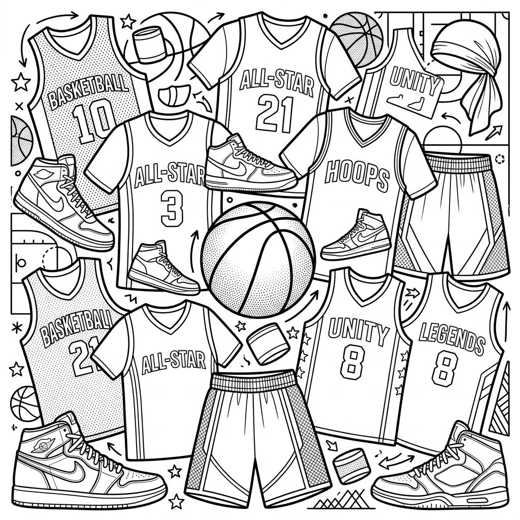 Get ready to hit the court with this exciting basketball activewear coloring page. Discover a dynamic collection of jerseys, shorts, and sneakers, all waiting for your creative touch.