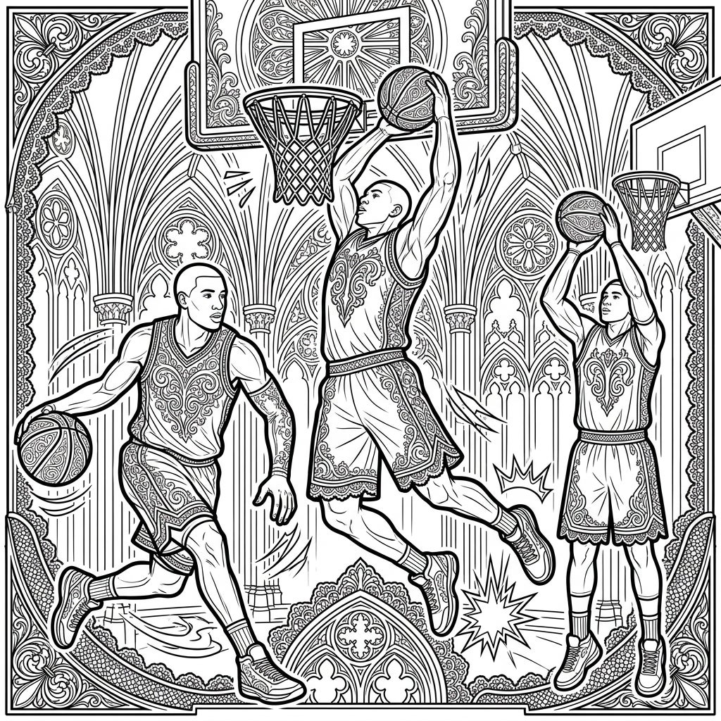 Unleash your creativity with this extraordinary coloring page, where the fast-paced world of basketball collides with the mysterious beauty of Gothic art. Discover three dynamic players set against an intricately detailed backdrop of ornate arches and dramatic shadows.
