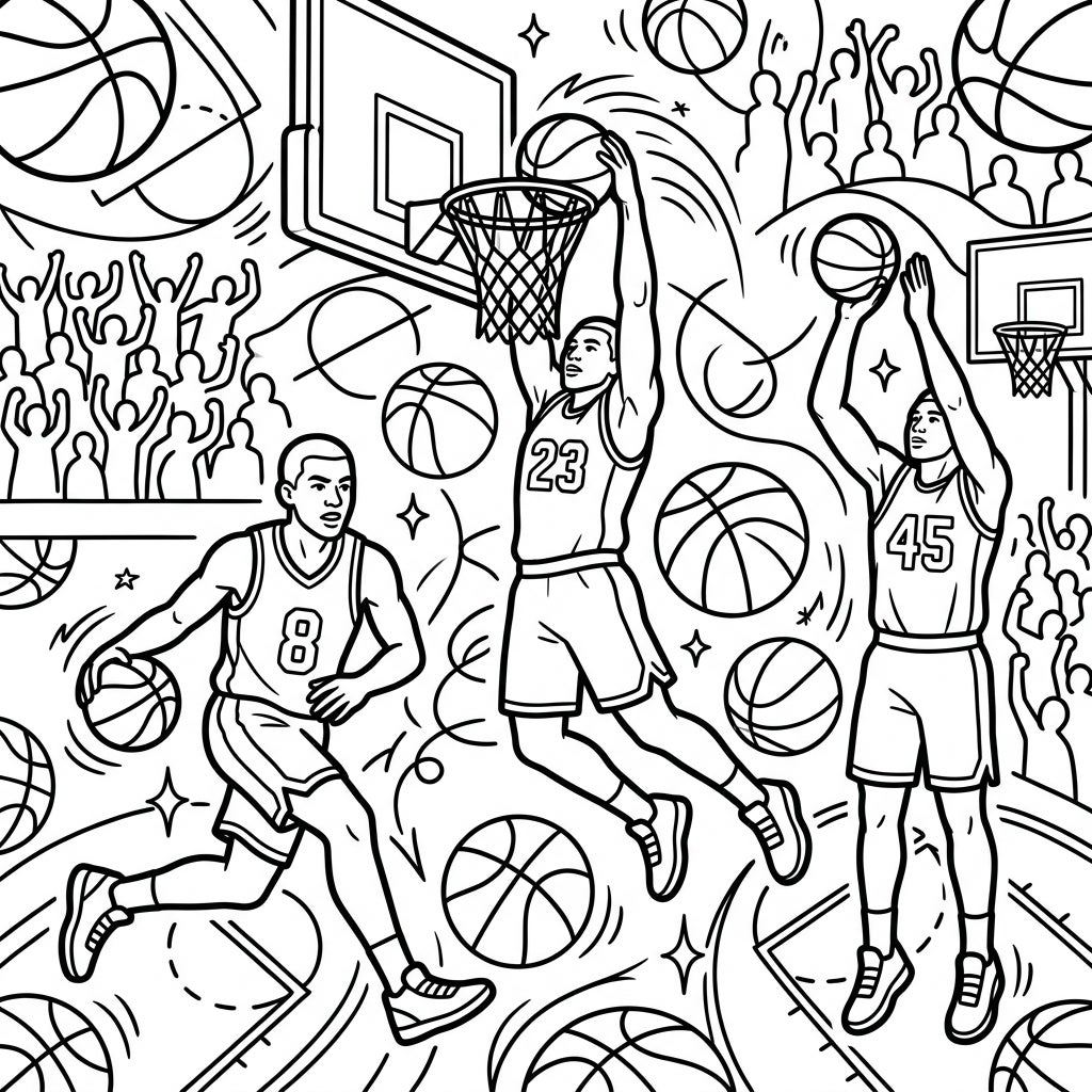Immerse yourself in the electrifying atmosphere of a basketball game with this detailed coloring template! This action-packed illustration features three dynamic basketball players caught in peak moments of play: one skillfully dribbling down the court, another soaring through the air for a powerful slam dunk, and a third poised for a perfect shot. The background is thoughtfully designed with swirling basketballs, precise court lines, and cheering crowd silhouettes, creating a truly immersive sports scene ready for your artistic touch.