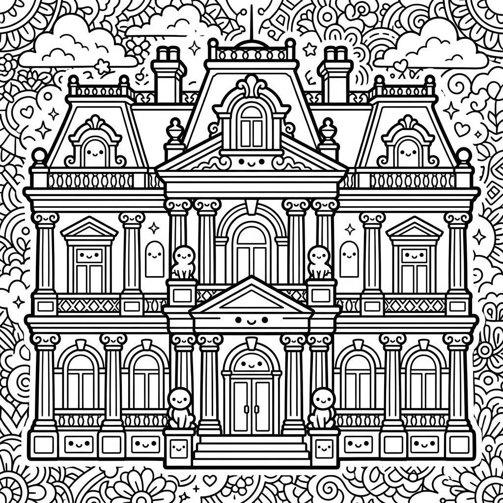 Step into a world where architectural magnificence meets irresistible cuteness with this unique coloring page featuring a Beaux-Arts mansion rendered in a delightful Kawaii style. You'll find a grand, symmetrical facade adorned with classical columns, ornate window frames, and majestic roofs, all softened and made charming by rounded edges and thick, inviting outlines. Look closely, and you'll discover adorable smiling faces peeking from windows, pillars, and even the entryways, transforming this stately home into a friendly, whimsical abode.