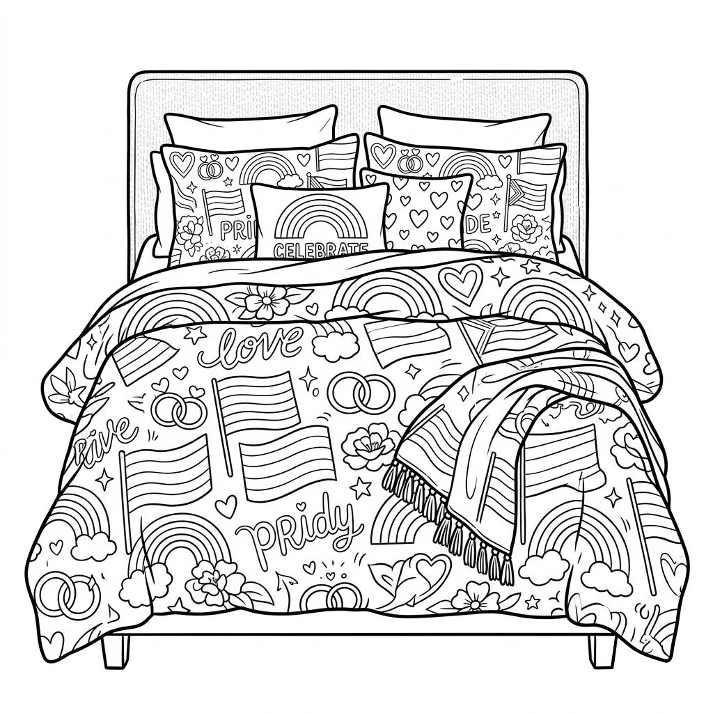 Unleash your inner artist by bringing this intricate bedding design to life. Experiment with bright, bold colors for the rainbows and flags, or choose softer, more pastel tones for a dreamy effect. Consider using different shades and textures for the various elements to make them pop. This page is an excellent opportunity to practice your fine motor skills and explore color theory while creating a beautiful piece of art that celebrates love in all its forms.