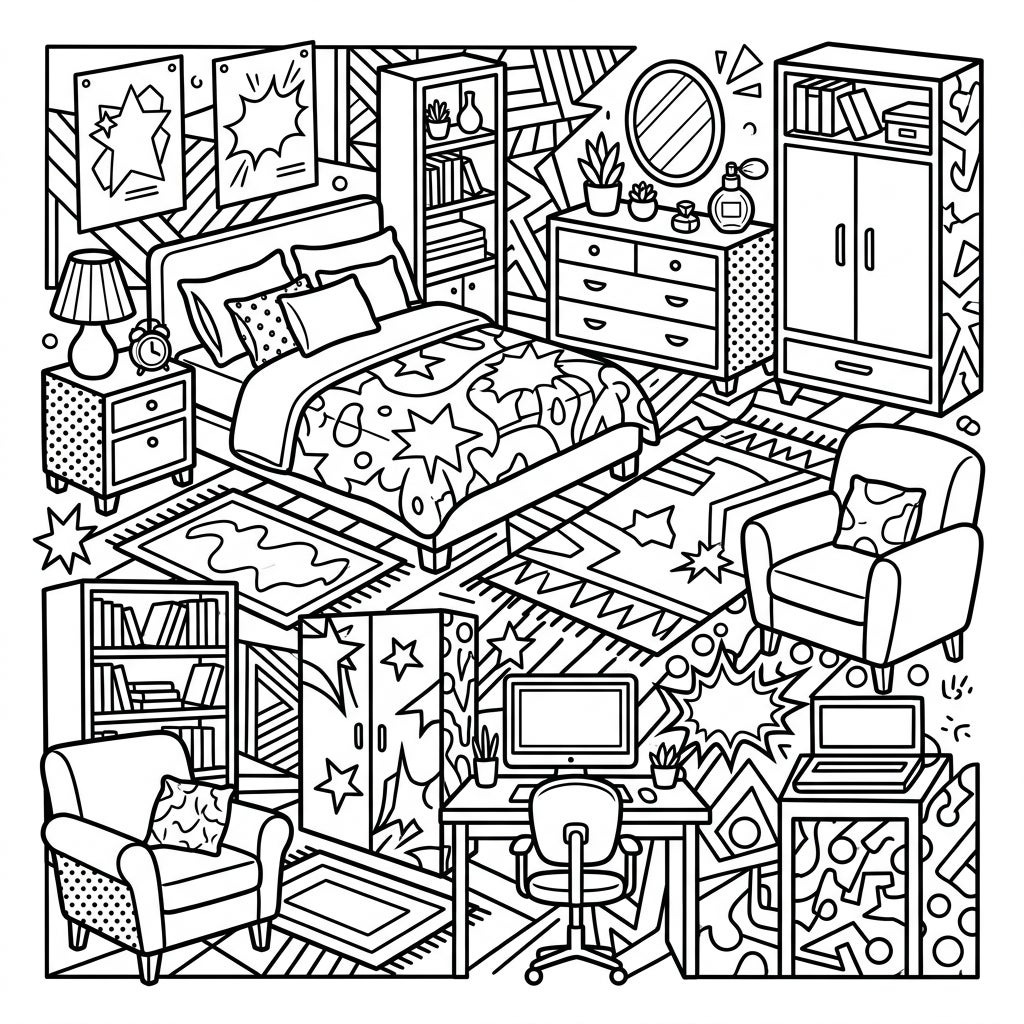 Unleash your inner artist with this fantastic Pop Art bedroom coloring page! This intricate design features a complete bedroom setup, from a cozy bed with patterned bedding and soft pillows to functional nightstands, a stylish dresser topped with a mirror and perfume bottle, and a spacious wardrobe. You'll also find a comfortable armchair, a modern desk complete with a computer monitor, and even a laptop station, all waiting for your creative flair.