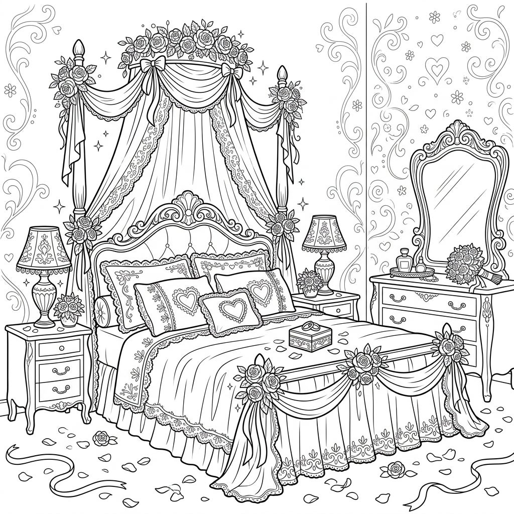 Unveil a scene of pure bridal elegance with our Wedding Bedroom coloring page. This intricate line art illustration captures a lavish four-poster bed, beautifully draped with flowing fabrics, delicate lace, and an abundance of blooming roses. Flanking the bed are two ornate nightstands, each holding an elegant lamp and a small, charming bouquet. Across the room, a sophisticated dressing table with a grand mirror awaits, complete with a perfume bottle and a fresh wedding bouquet, inviting you to bring every detail to life with your chosen colors.