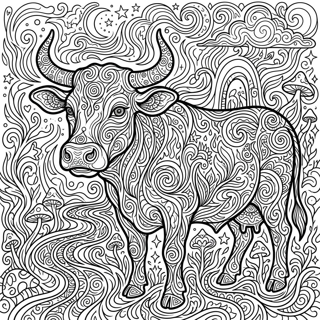 The 'psychedelic' vibe of this artwork challenges conventional perceptions, offering a truly 'trippy' and engaging coloring experience. Delicate lines twist and turn, creating an ethereal landscape filled with fanciful mushrooms, twinkling stars, and ethereal clouds that frame our bovine friend. This isn't just a coloring page; it's an invitation to lose yourself in a meditative flow, where each stroke of color brings this fantastical scene to life and allows your imagination to roam free.