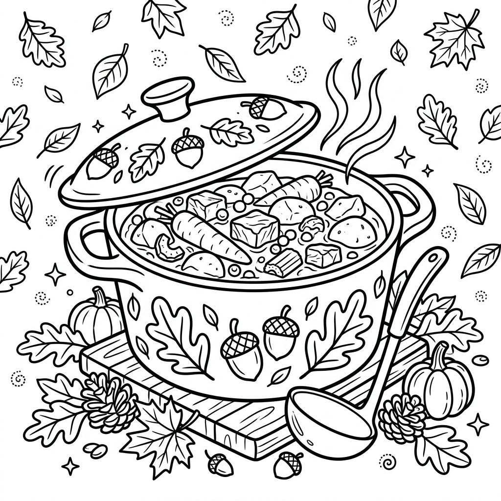 This charming coloring page invites young artists to explore a delightful autumn scene centered around a bubbling pot of beef stew. The pot, with its lid playfully ajar, reveals generous chunks of savory beef, plump carrots, and other vegetables, all steaming gently. Beside it, a waiting ladle hints at the delicious meal to come, making this an inviting tableau for hungry imaginations.