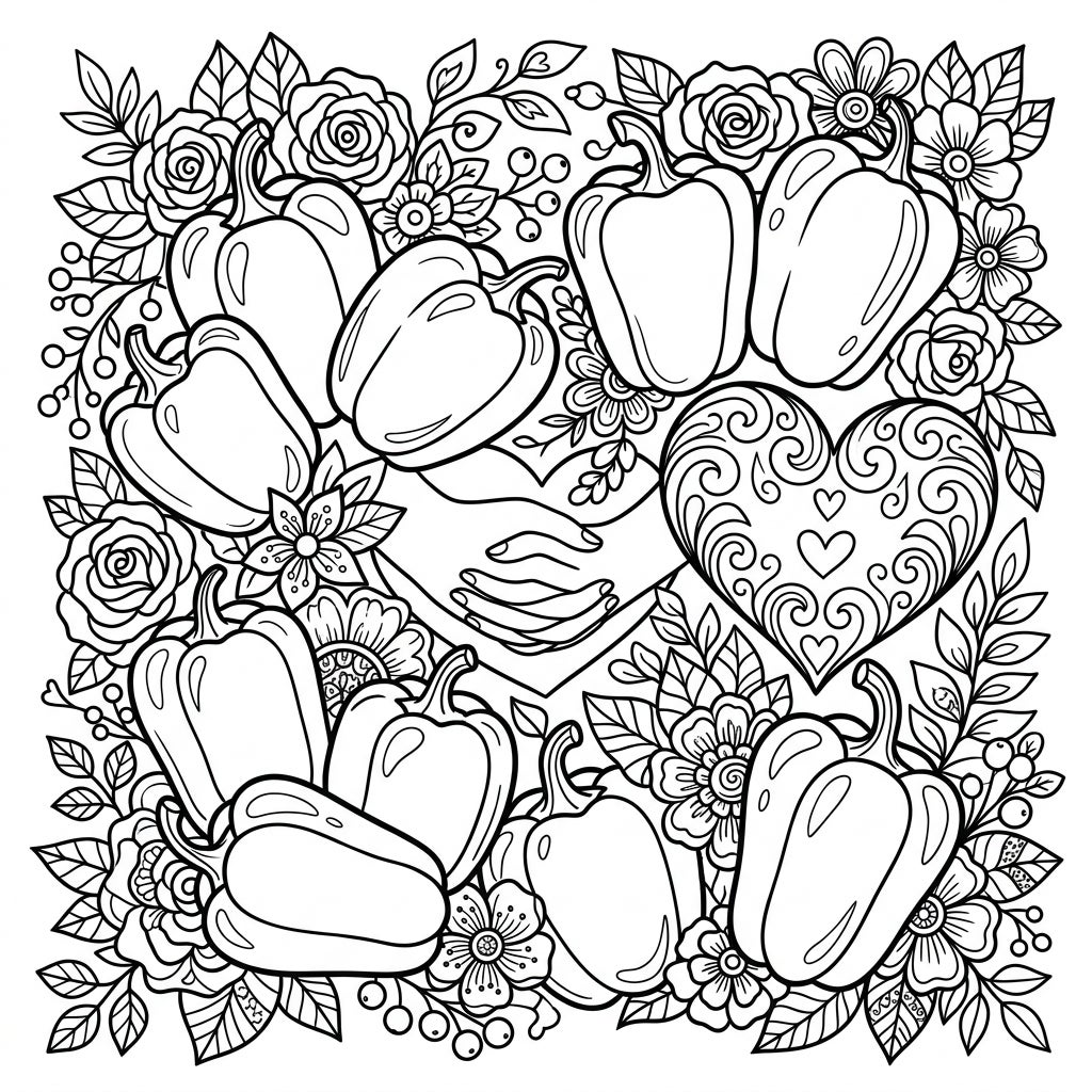 Unleash your creativity as you bring this beautiful scene to life with color. Experiment with classic vibrant hues for the bell peppers—think bright reds, sunny yellows, and lush greens—or venture into fantastical shades for a truly unique artistic interpretation. The intricate floral elements offer endless possibilities for blending and shading, while the detailed heart and hands invite careful attention, making this coloring experience both relaxing and rewarding. Grab your favorite coloring tools and let your imagination bloom!