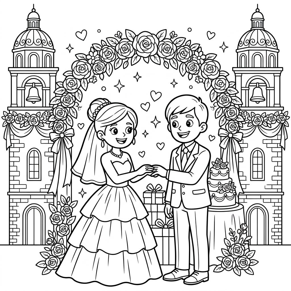 Join a happy bride and groom as they exchange vows under beautiful floral arches, flanked by grand bell towers. This delightful kids' coloring page perfectly captures the magic of a wedding celebration.