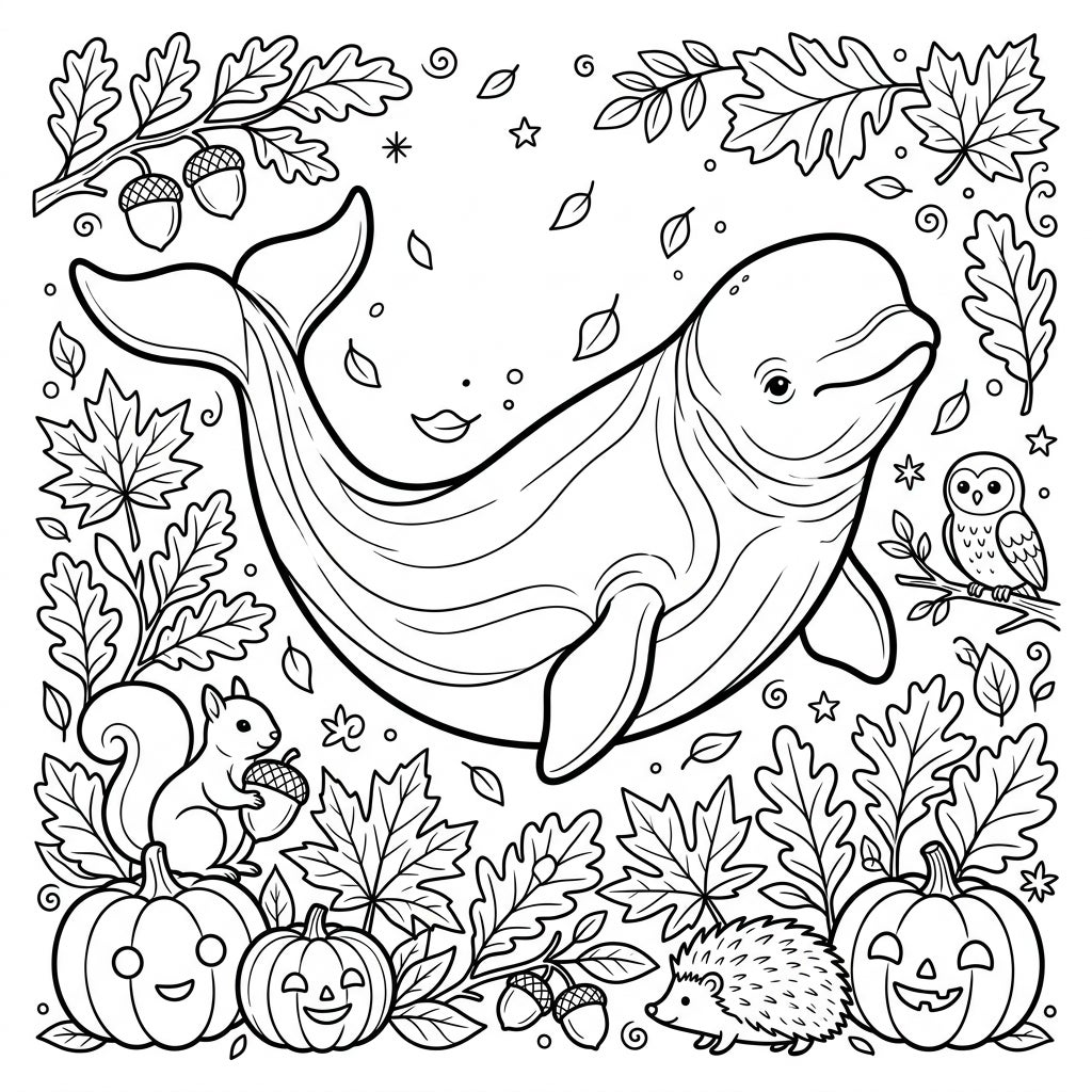 Immerse yourself in a charming autumn tableau where the gentle beluga whale takes center stage, playfully gliding through a richly detailed fall landscape. This intricate coloring page is framed by a bounty of classic autumn elements, including sprawling branches heavy with oak leaves and acorns, alongside vibrant maple leaves scattered throughout the scene. Look closely, and you'll discover a friendly squirrel clutching an acorn, a wise owl perched serenely on a branch, a cute hedgehog, and two cheerful pumpkins, one with a carved grin, adding a touch of festive fun.