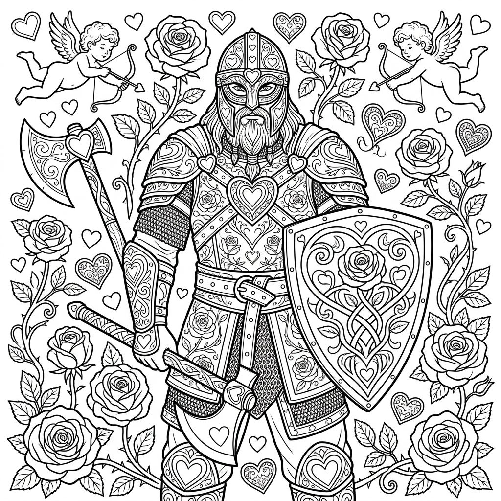Prepare your palette for an engaging coloring experience. Will you lean into traditional Valentine's reds and pinks for the hearts and roses, contrasting them with metallic grays and earthy browns for the Berserker's armor and beard? Or perhaps you'll explore a more fantastical approach, using vibrant jewel tones to highlight the intricate details and bring this romantic warrior to life. Let your imagination run wild as you add depth and personality to this exceptional coloring template.