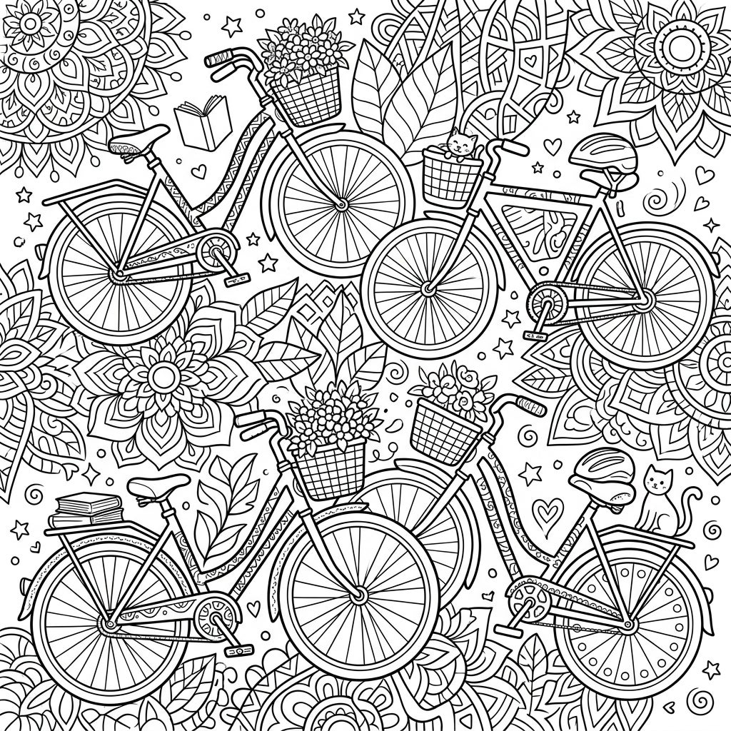This stunning coloring template transports you to a whimsical scene filled with the charm of bicycles. Multiple intricately designed bikes are showcased, each adorned with delightful details such as overflowing flower baskets, carefully stacked books on a rear rack, and even a curious cat perched gracefully. The background is a tapestry of elaborate floral patterns, delicate mandalas, lush leaves, and whimsical accents like stars and hearts, ensuring every inch of the page offers a rich visual experience.