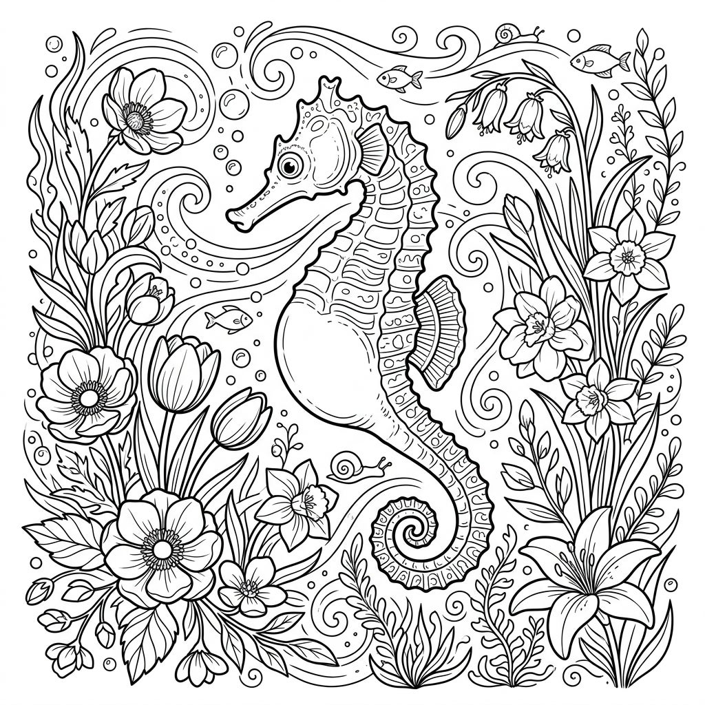 Delve into a mesmerizing world where the ocean meets the garden in this intricate coloring template. A magnificent Big-Belly Seahorse, known for its distinctive rounded body and graceful form, takes center stage, its detailed scales and fins awaiting your creative palette. It glides serenely amidst a vibrant tapestry of spring's finest blossoms, including elegant tulips, cheerful daffodils, delicate anemones, and charming bluebells, all intertwined with lush aquatic foliage.