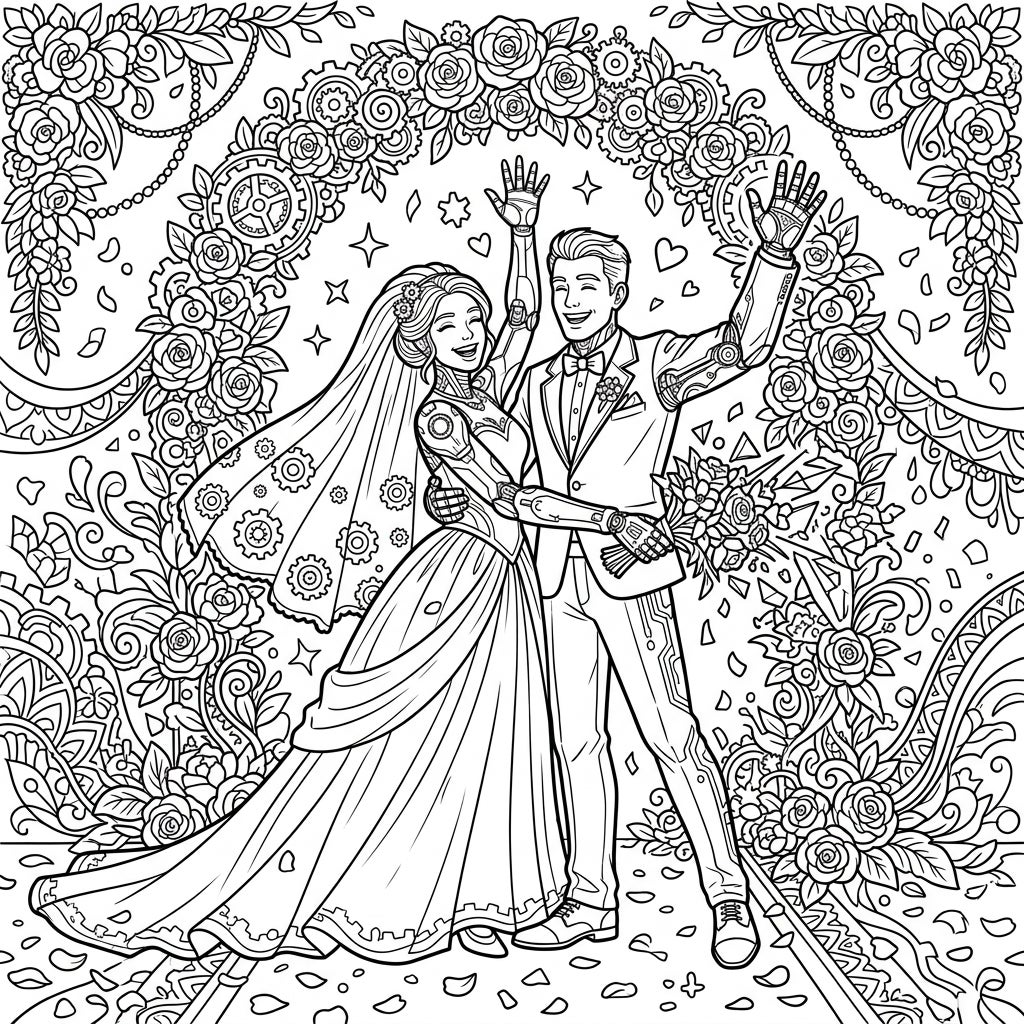 The scene is set against a magnificent floral arch, rich with blooming roses intertwined with industrial gears and intricate clockwork patterns, symbolizing the strength and delicate balance of their extraordinary love. Confetti and heart-shaped petals rain down, enhancing the festive and heartwarming ambiance. This coloring page offers a fascinating exploration of a wedding that transcends conventional boundaries, inviting you to imagine a world where bionic enhancements are celebrated in moments of profound joy.