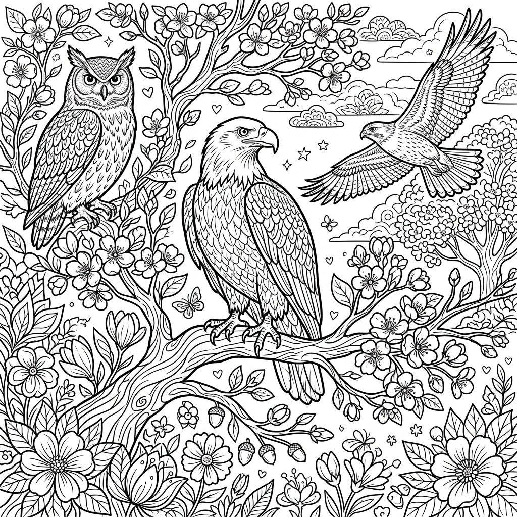 This exquisitely detailed coloring page invites you to explore the fascinating world of birds of prey set against the vibrant backdrop of spring. Perched majestically on a blossom-laden branch, a regal eagle surveys its domain while a wise owl gazes intently from another leafy perch. A powerful hawk soars gracefully through the sky, its wings outstretched, completing this dynamic aerial tableau. Every feather and claw is rendered with precision, offering an engaging challenge for colorists.