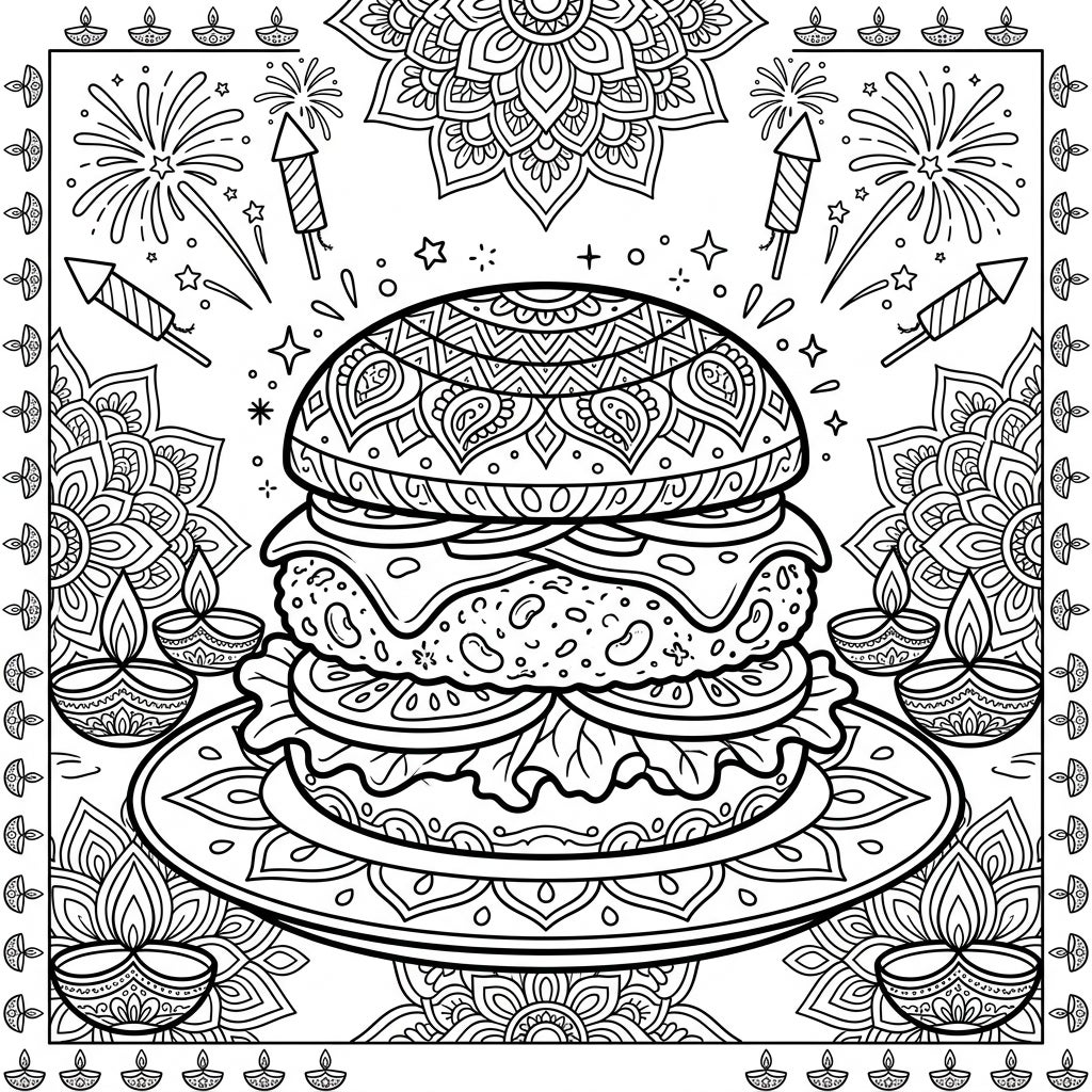 Unleash your imagination as you color this unique fusion! For Diwali elements, consider a palette of rich jewel tones, glittering gold, and sparkling silver to truly capture the festival's radiance. For the black bean burger, you can go realistic with earthy greens, reds, and browns, or embrace a fantastical approach with unexpected shades. This page offers ample opportunity for both intricate detailing and bold color choices, making it perfect for all skill levels. Download now and let the celebration begin!
