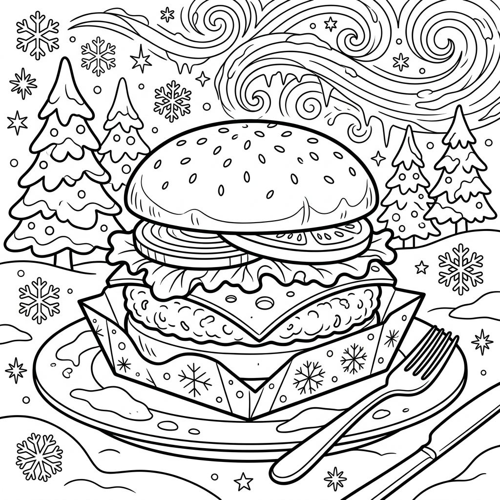 Let your creativity flourish as you decide on the vibrant hues for the burger ingredients – perhaps rich greens for the lettuce, ruby reds for the tomato, and golden browns for the bun and patty. Experiment with shades of blue and silver for the snowflakes and background elements to truly capture the wintry atmosphere. This page offers endless possibilities for color exploration, making it an engaging project for colorists of all skill levels.