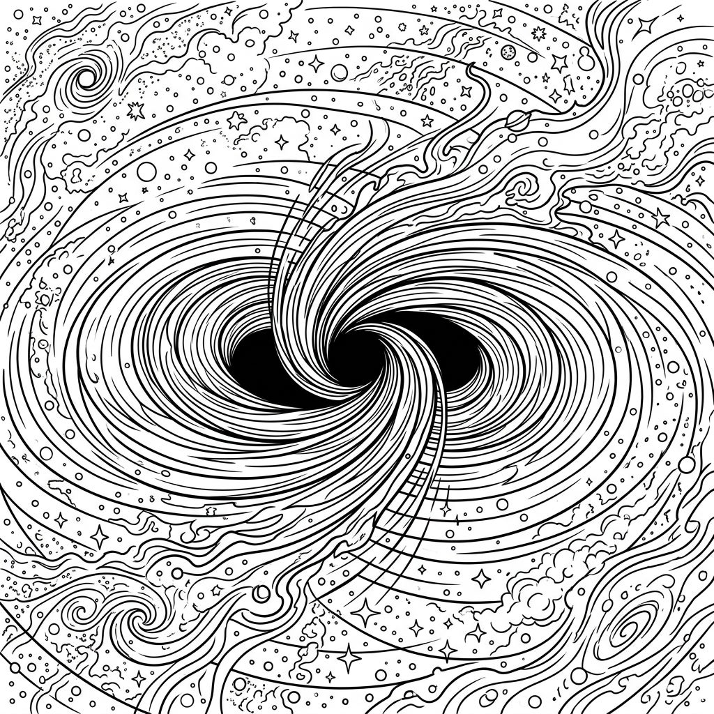 Prepare for an extraordinary journey into the heart of the cosmos with this intricate Black Hole Mergers coloring page. This stunning design features two colossal black holes locked in a dramatic embrace, their event horizons spiraling together to form an even larger singularity. The pure line art style beautifully captures the immense gravitational forces at play, with delicate lines swirling outwards, depicting streams of matter and energy being drawn into the cosmic abyss.