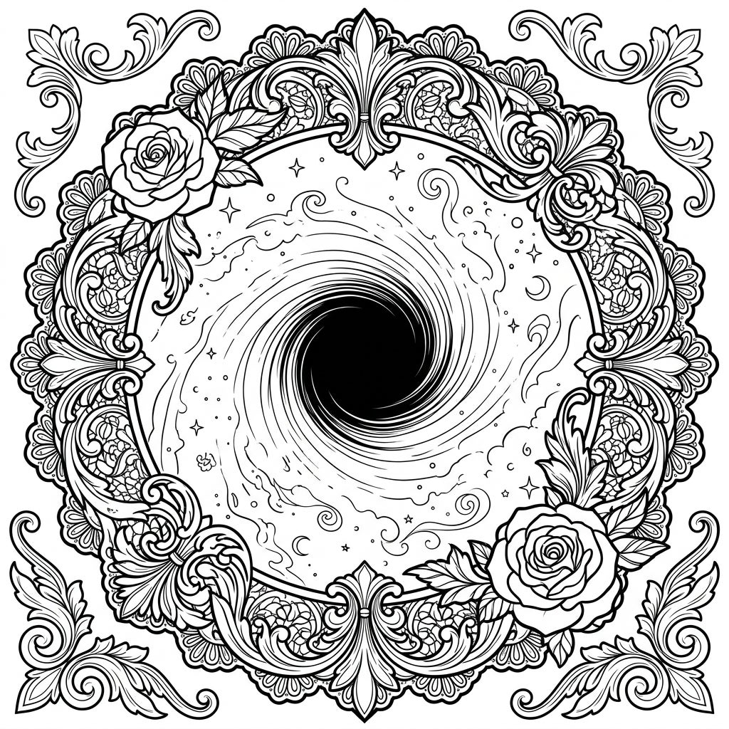 Explore the mesmerizing depths of a black hole, elegantly framed by intricate gothic artistry. This unique coloring page invites you to blend cosmic wonder with dark, romantic aesthetics.