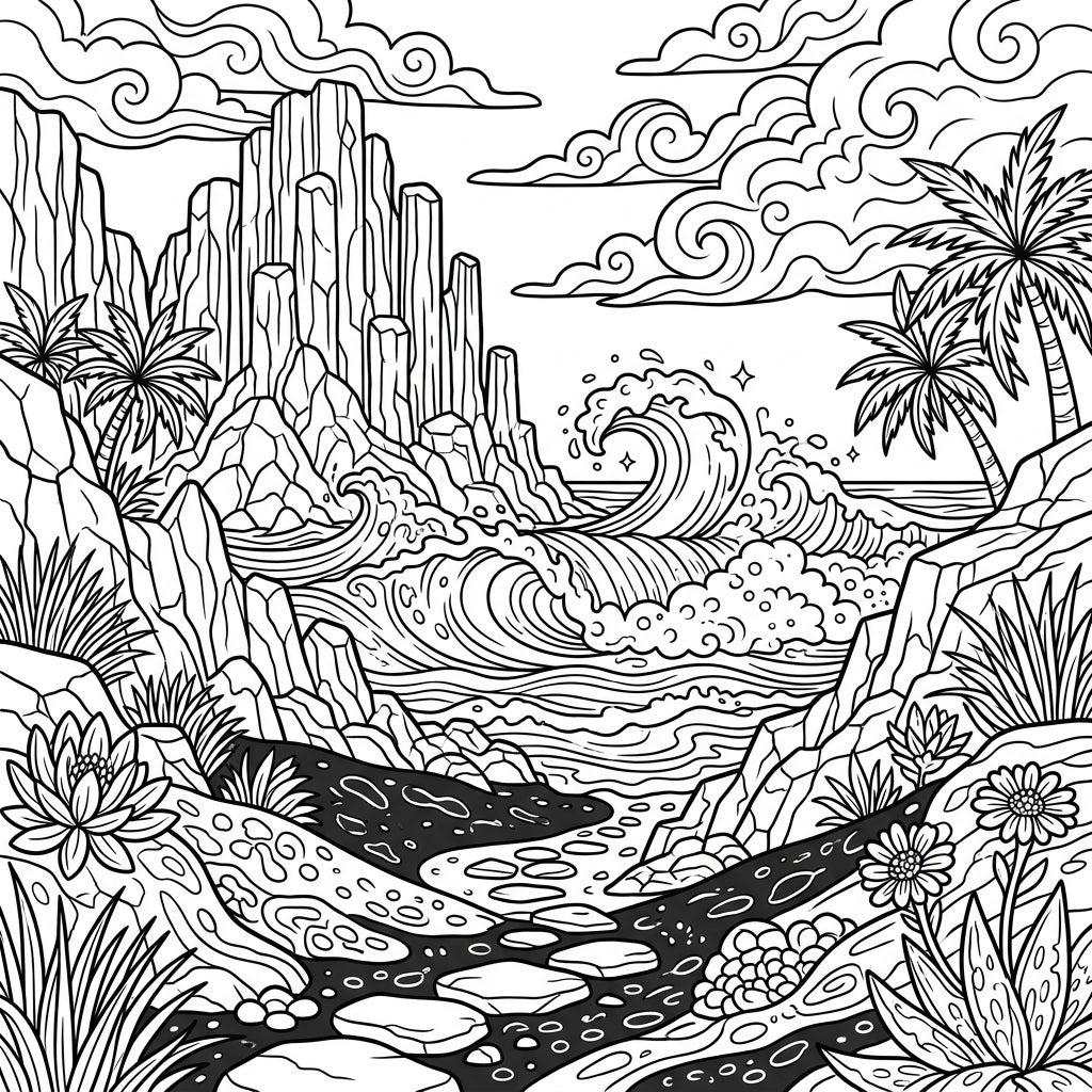 Embark on an artistic journey to a stunning black sand beach with this intricate coloring page for teens. Discover dramatic volcanic cliffs, powerful ocean waves, and exotic coastal flora ready for your vibrant imagination.