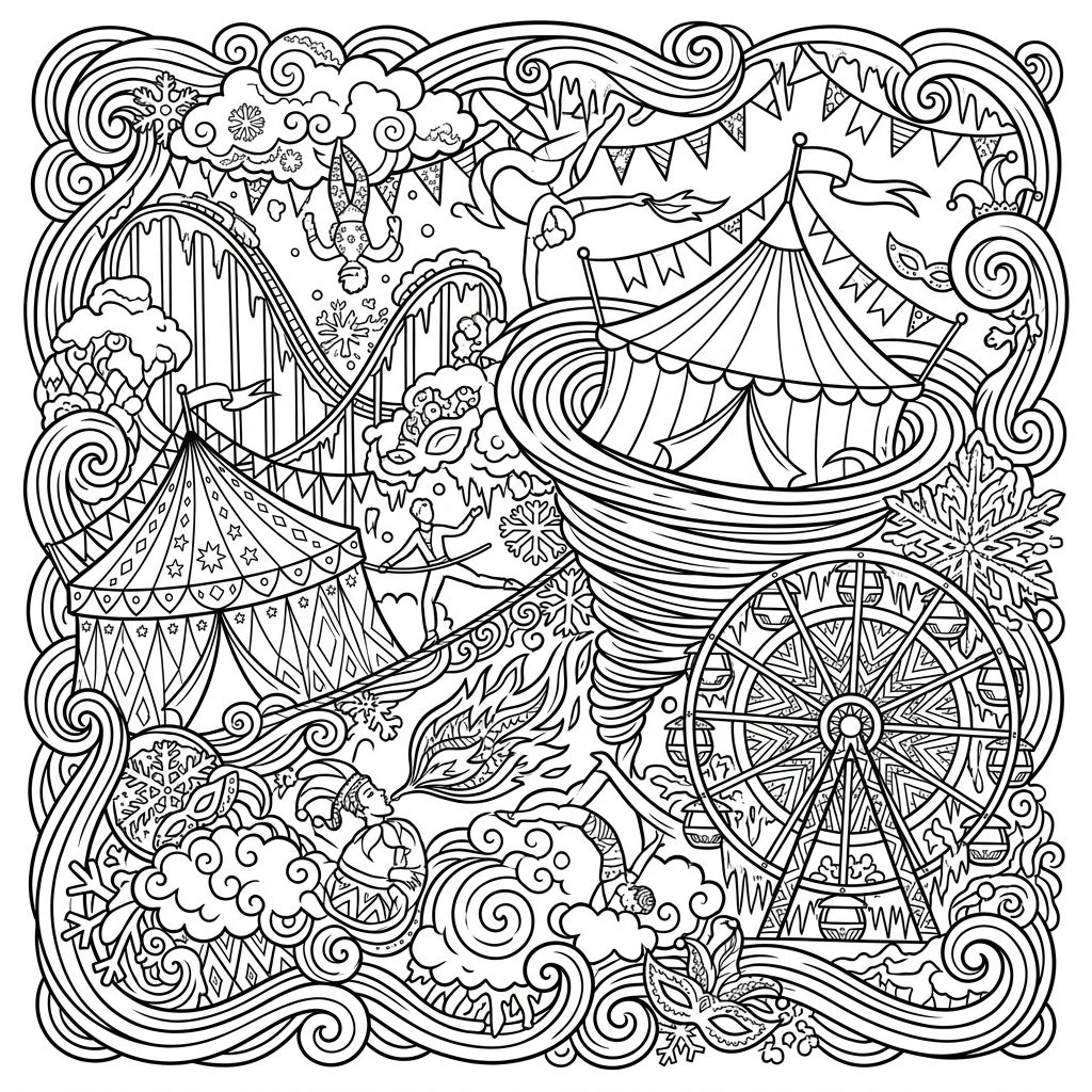 Step right up and witness an extraordinary spectacle where the wild energy of a blizzard merges with the joyous chaos of a carnival! This incredibly detailed coloring page invites you to explore a fantastical landscape filled with intricate line art. Discover majestic circus tents, a towering Ferris wheel, and a thrilling roller coaster, all intricately woven into a swirling vortex of snowflakes and winter winds, alongside daring performers and festive decorations.