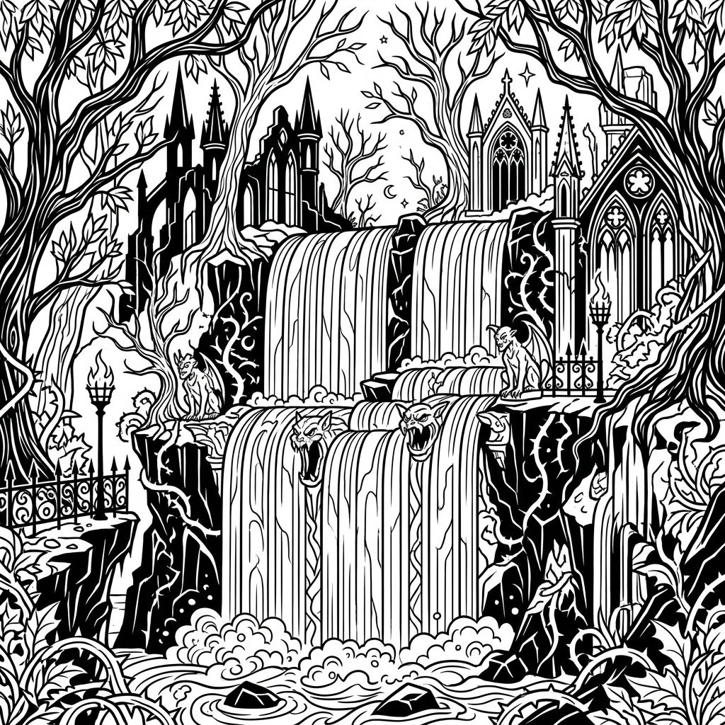 Journey into a realm of dark enchantment with this stunning block waterfall coloring page. Explore a majestic gothic landscape where ancient ruins and mythical creatures meet cascading waters, offering a truly unique artistic escape.