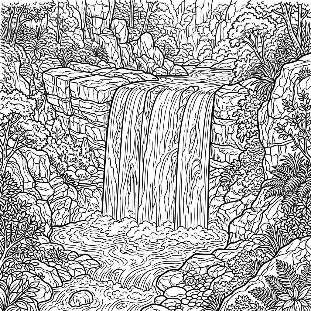Discover the beauty of a powerful block waterfall captured in this detailed coloring page, designed specifically for seniors. Enjoy large print and intricate natural elements, offering a peaceful and engaging artistic experience.