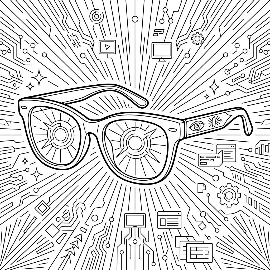 Unleash your artistic flair with this captivating coloring page featuring a sleek pair of blue light blocking glasses taking center stage. The lenses cleverly showcase a radiating filter effect, symbolizing their protective power. Surrounding this modern eyewear is an electrifying backdrop of intricate circuit board patterns, interwoven with familiar digital icons like computers, gears, and abstract data flow, creating a dynamic and visually stimulating world waiting for your personal touch.