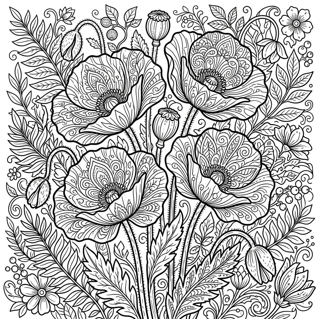 This captivating adult coloring page presents a rich tapestry of blue poppies, rendered with exceptional detail. Each poppy boasts petals adorned with intricate, swirling patterns, reminiscent of delicate mandalas, inviting a focused and meditative coloring session. The composition is expertly filled with lush botanical elements, including emerging buds, developing seed pods, and a variety of leaves and tendrils that intertwine throughout the design, creating a truly immersive floral landscape without any empty spaces.