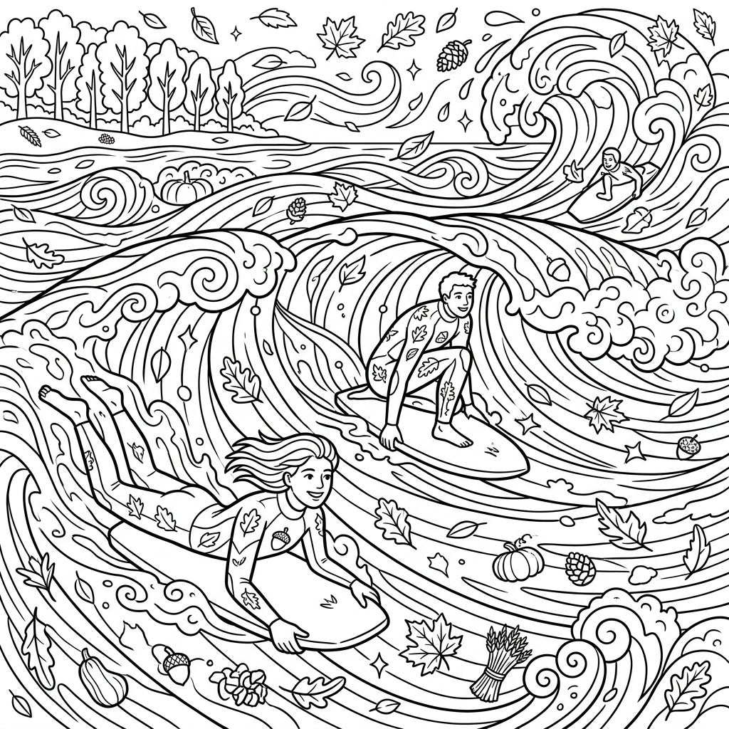 Beyond the exhilarating action, this page is steeped in the cozy, vibrant atmosphere of autumn. Look closely and you'll discover a wealth of fall-themed details integrated into the watery landscape: scattered oak and maple leaves, plump pumpkins, prickly pinecones, and even a rustic bundle of wheat. These charming elements transform a typical beach scene into a whimsical autumn seascape, inviting colorists to explore the surprising harmony between crisp fall air and the cool ocean spray.