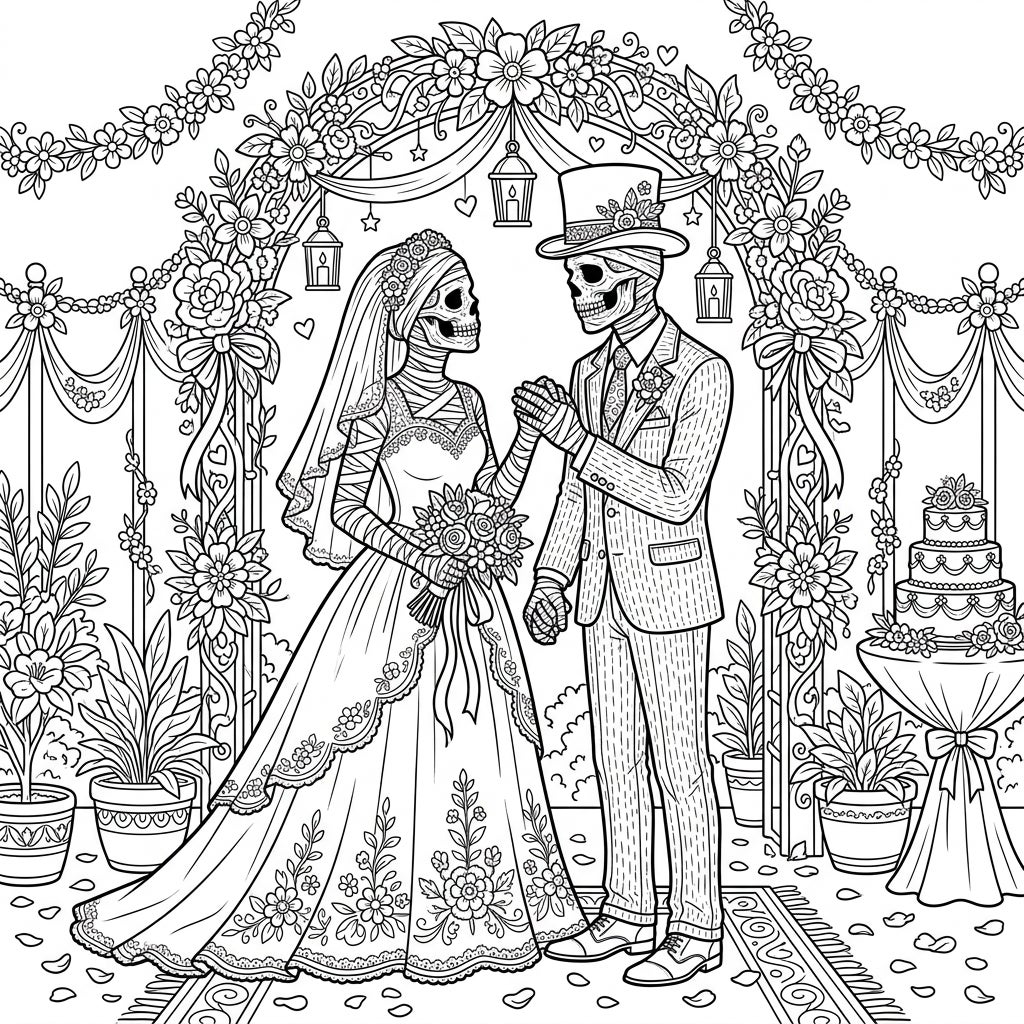 Unveil a truly unique celebration with this captivating Bog Mummy Wedding coloring page. At its heart, a distinguished mummified groom in a top hat and suit lovingly holds hands with his equally elegant mummified bride, adorned in a flowing gown, veil, and carrying a delicate bouquet. They stand beneath a magnificent floral arch, intricately detailed with blossoms, ribbons, and lanterns, setting a scene of timeless romance.
