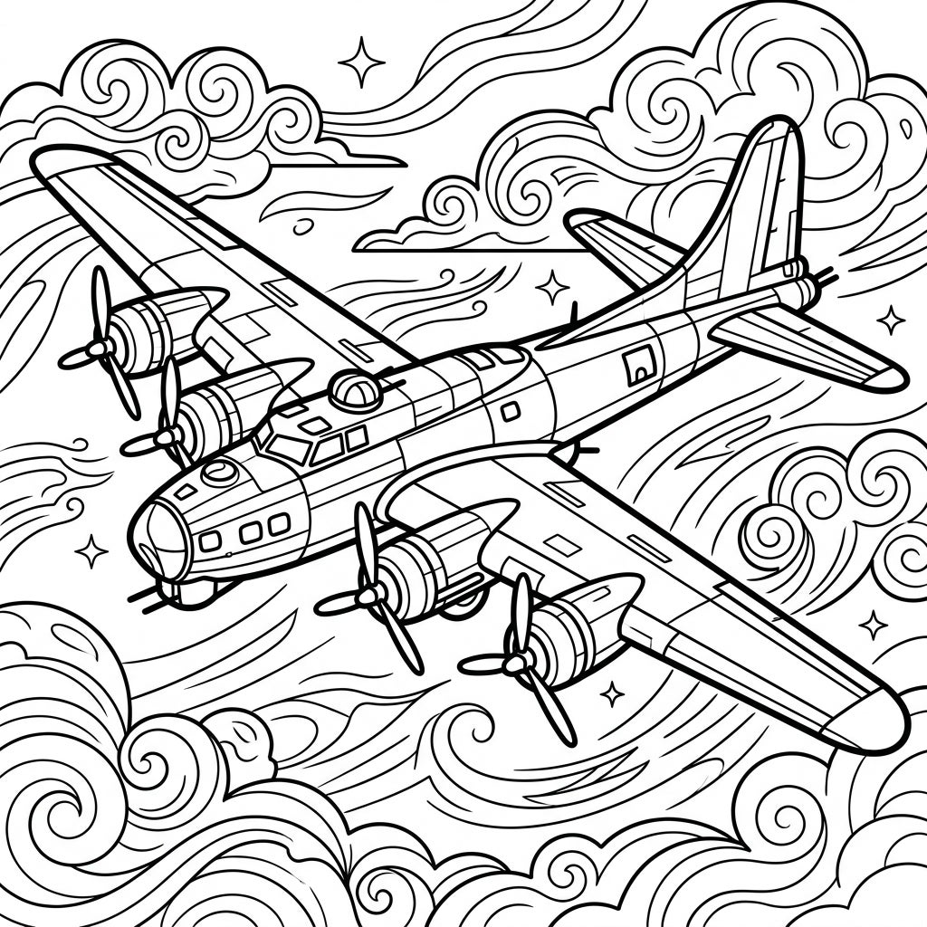 Dive into the intricate world of aviation with our stunning bomber aircraft coloring page, meticulously crafted for teen enthusiasts. This template features a powerful military plane, rendered with striking detail, including its multiple engines, propellers, and distinct fuselage. The aircraft dominates the scene, majestically set against a dynamic backdrop of swirling, stylized clouds and subtle star accents, creating a sense of movement and grandeur that fills the entire frame.
