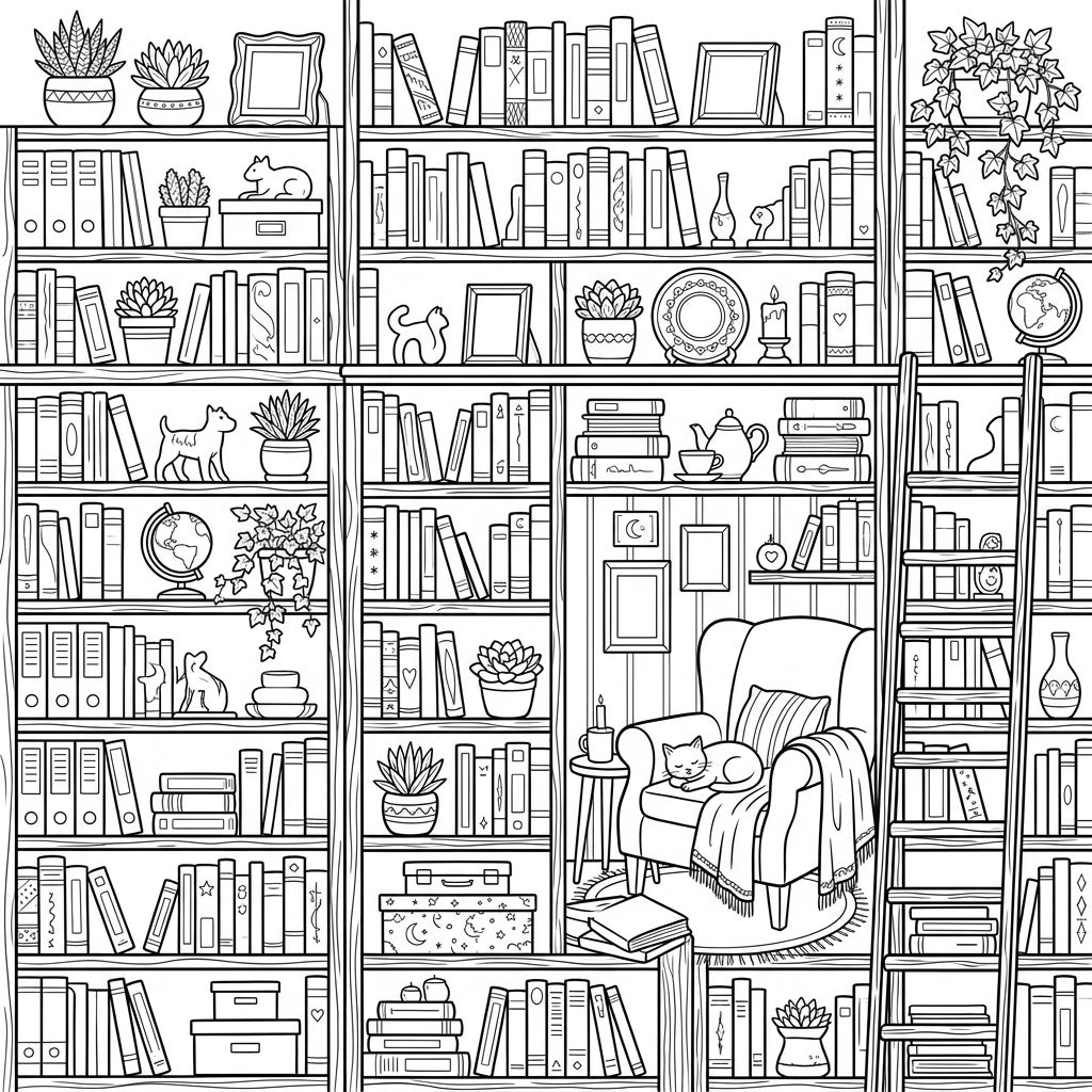 Explore a magnificent wall of packed bookshelves, brimming with stories and curiosities, waiting for your artistic touch. Discover a serene reading nook, complete with a sleeping cat, inviting you to color a world of literary charm.