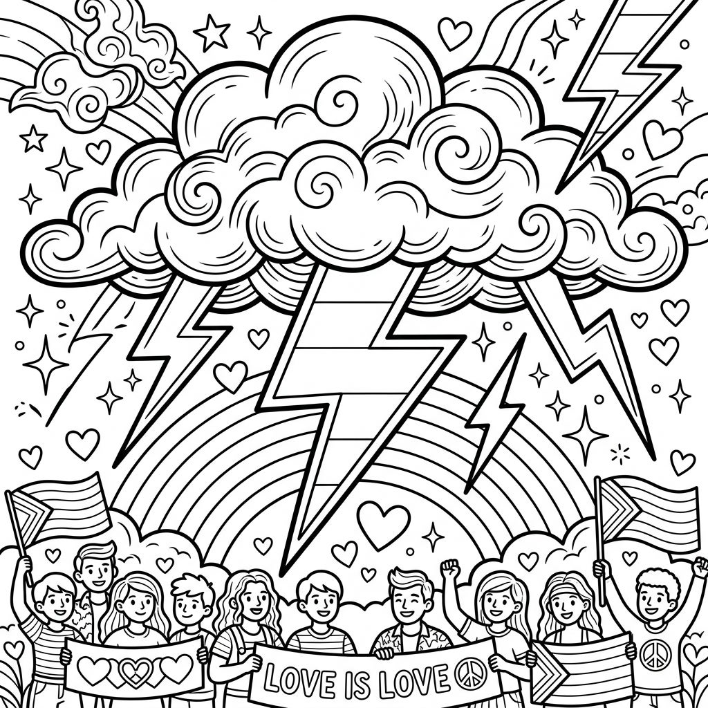This captivating coloring page merges the raw power of nature with the joyous spirit of Pride Month. At its heart, a magnificent, swirling storm cloud dominates the upper half, unleashing bold lightning bolts that pierce through the scene. Beneath this dynamic sky, a prominent rainbow arc serves as a bridge, leading to a cheerful assembly of diverse individuals, all ready to celebrate. Intricate patterns, scattered hearts, and shimmering stars fill the background, adding layers of detail and a sense of wonder to the composition.