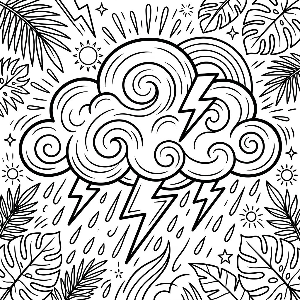 Experience the dramatic beauty of a summer storm with this captivating coloring page. Dive into a scene where powerful thunderclouds meet lush tropical foliage, offering a unique blend of excitement and relaxation.