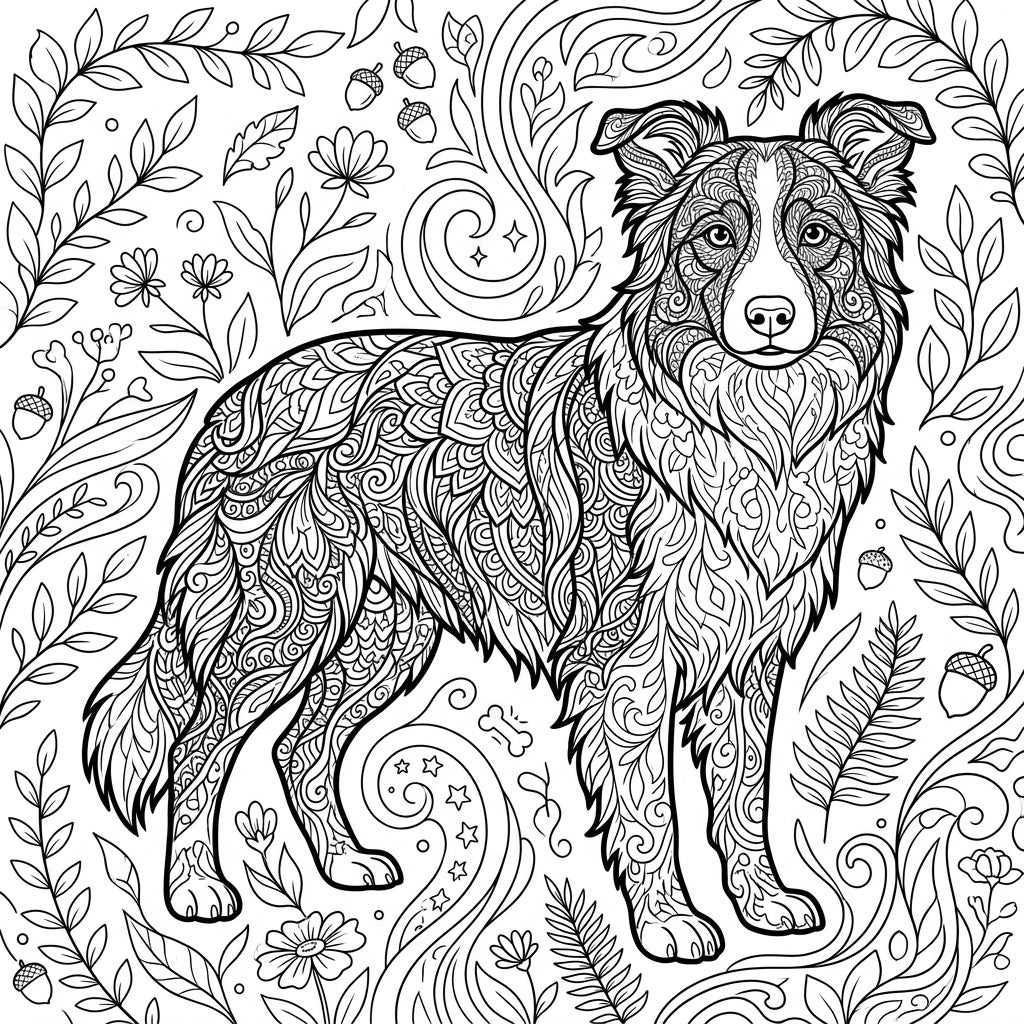 Dive into a world of detailed artistry with this exquisite Border Collie coloring page. The majestic dog stands proudly, its fur adorned with a mesmerizing array of intricate patterns, from swirling mandalas to delicate scales, inviting you to explore every curve and line. Surrounding our canine friend, a rich tapestry of nature unfolds, with meticulously drawn leaves, acorns, charming flowers, and whimsical swirls creating a captivating forest floor and canopy.